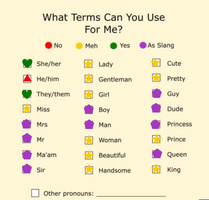 Below are my preferred pronouns, and terms you may use to refer to me/speaking with me.